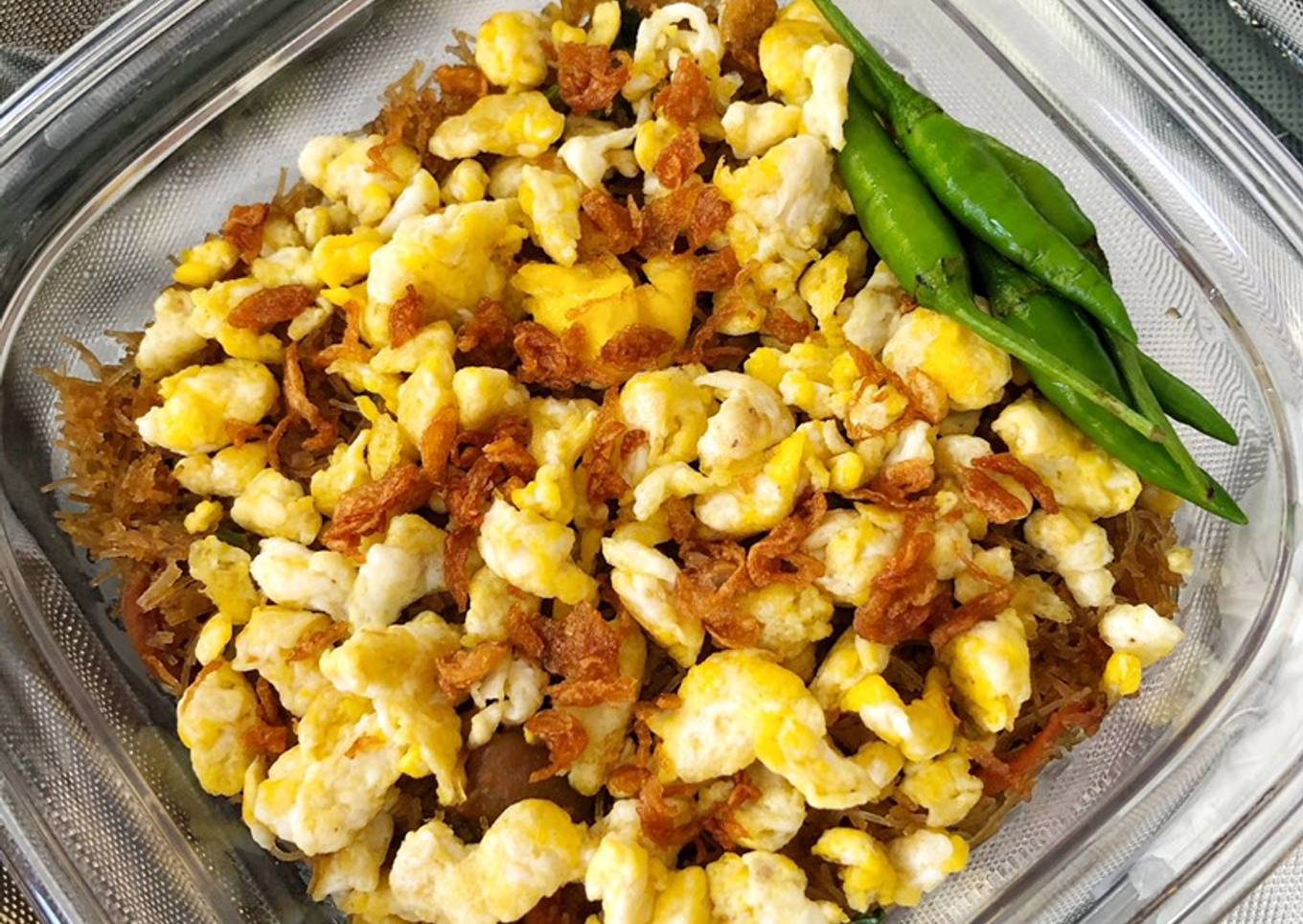 - Masukkan bihun dan aduk hingga semuanya rata. Tambahkan telur orak arik dan bawang goreng. Sajikan.