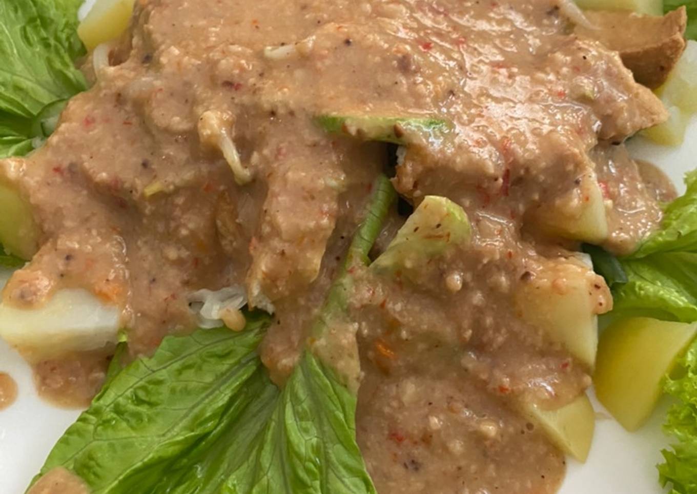 - Siapkan semua lauk di atas piring. Siram dengan bumbu kacang. Makan dengan kerupuk lebih mantap.