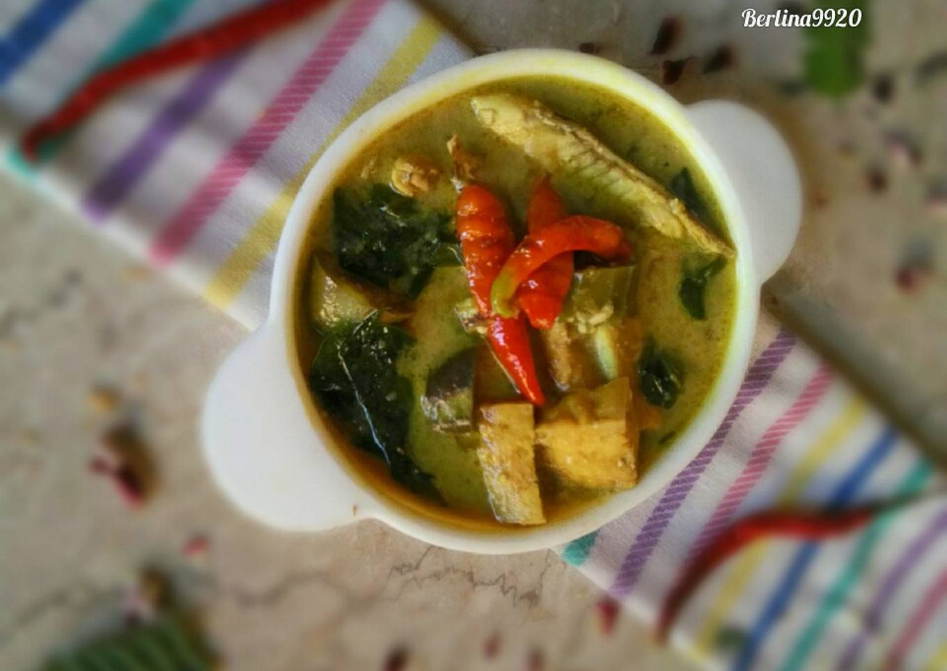 - Setelah air mendidih, masukan ikan pindang, cabai rawit utuh *kalau suka pedas bisa langsung diulek dengan bumbu halus lainnya*, tahu, terong dan daun melinjo.