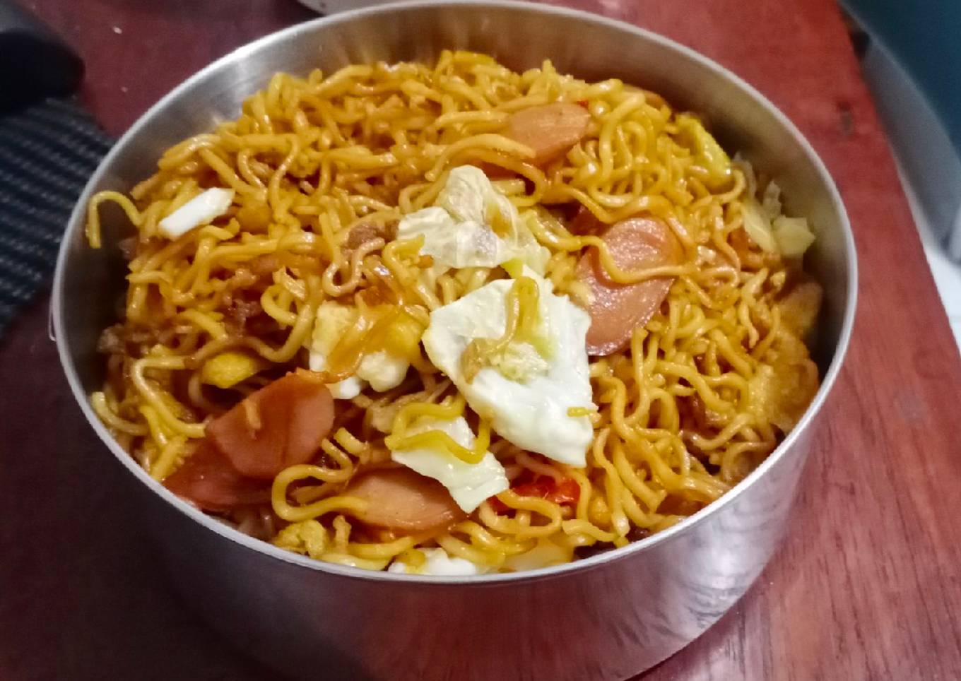 - Kemudian masukkan rebusan mie tadi. Beri kecap manis dan bumbu seasoning, kecuali garam. Masak hingga semua bumbu tercampur rata. Koreksi rasa. Pada tahap ini garam boleh dimasukkan jika perlu. Aduk rata, dan selesai. Mie goreng siap disajikan. Enak bila ditambah acar timun. Saya lagi ngga punya.