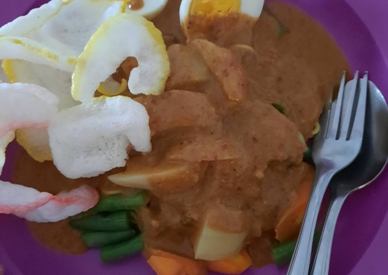 - Penyajian. Potong semua sayuran yg direbus sesuai selera, jangan lupa seladanya juga, tambahkan tahu goreng yg dipotong2 juga. Potong telur rebus menjadi 2,susun di piring. Jika sudah siap, siram dgn kuah kacangnya. Terakhir, beri kerupuk sesuai selera. Bisa ditambah dengan lontong atau makan dengan nasi ya bun 😊 selamat mencoba 🤗