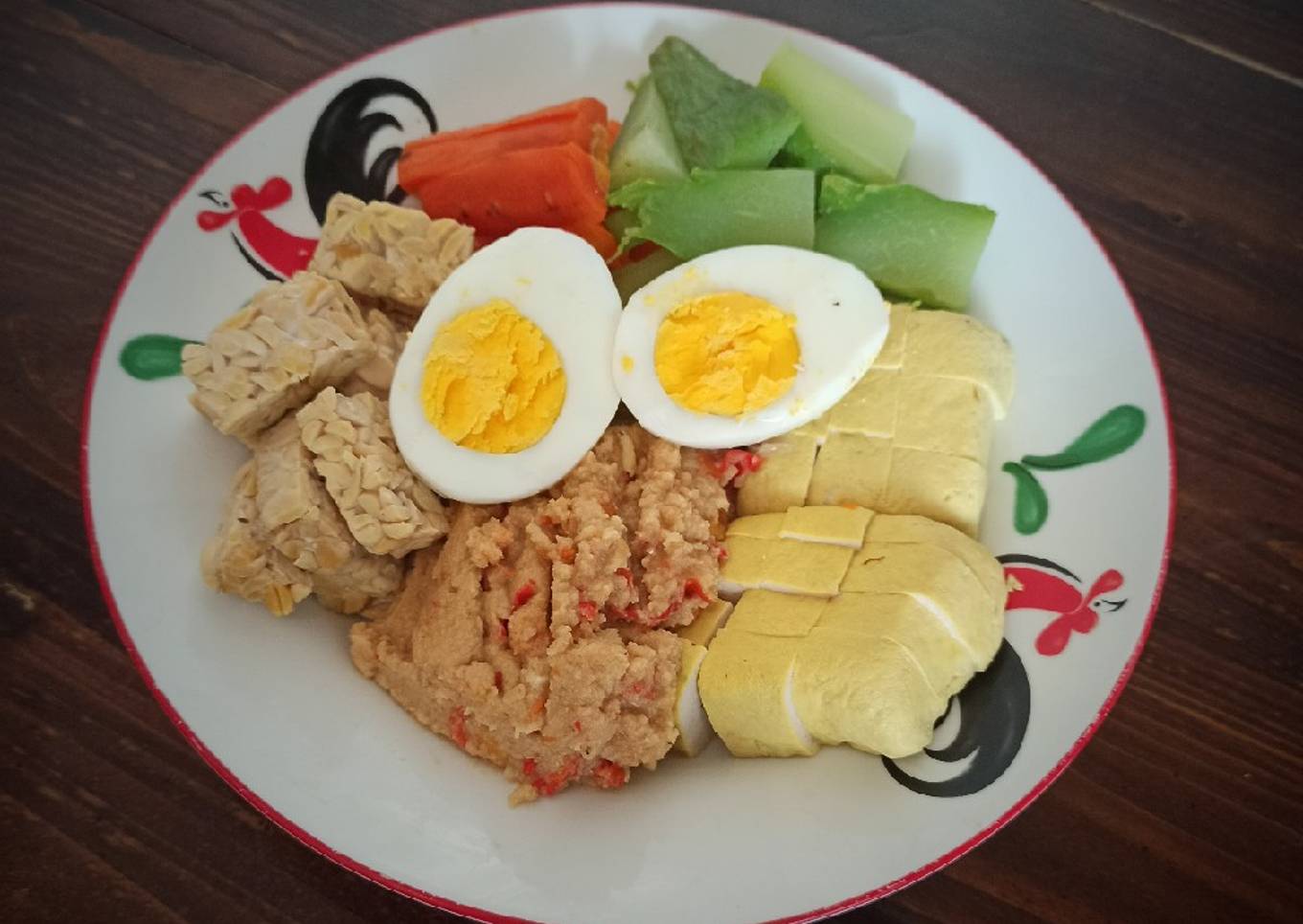 - Siapkan piring, susun semua bahan dan sambalnya. (Plate all the Vegetables, Egg, Tofu and Tempe. Don't forget to add the sambal. Well!!!)