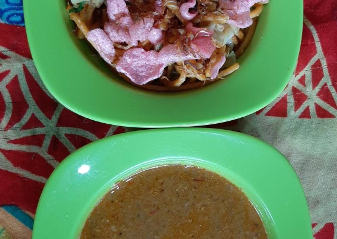 - Cairkan bumbu pecal dengan air hangat. Sajikan bersama mie gorengnya.