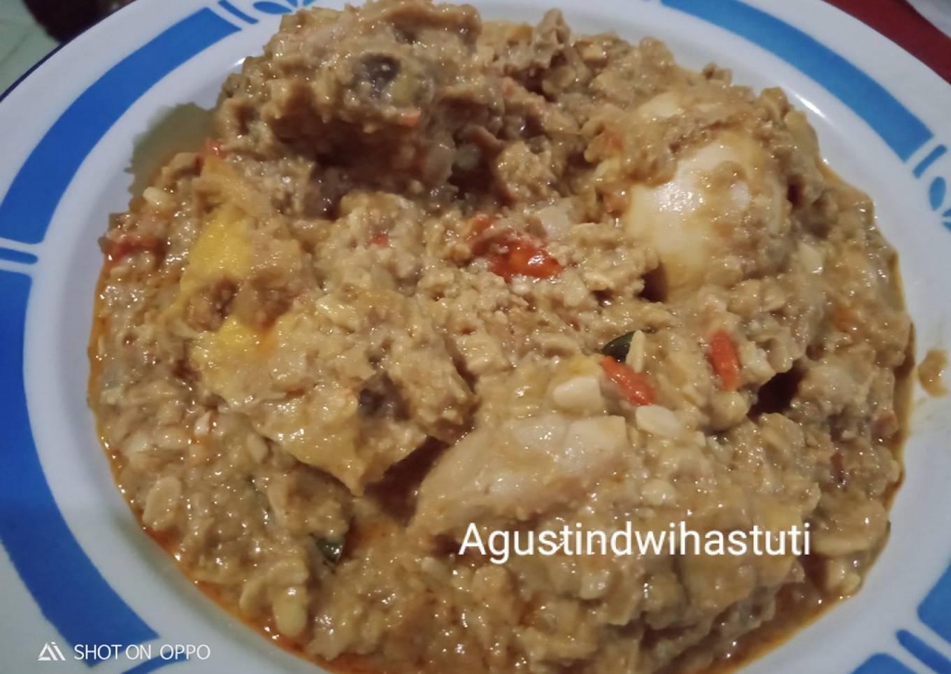 - Setelah direbus uleg semuanya (kalau saya suka yang tidak terlalu halus). Lalu masukkan kembali kedalam air rebusan tadi. Lalu nyalakan api dan bumbuin. Masukkan tahu dan telur. Jika air dirasa kurang bisa ditambah lagi. Sambil diaduk-aduk tunggu sampai meletup-letup. Lalu tuang santan cair instan tunggu hingga mendidih sambil terus diaduk. Koreksi rasa. Jika rasanya sudah pas lalu matikan api dan sajikan.
