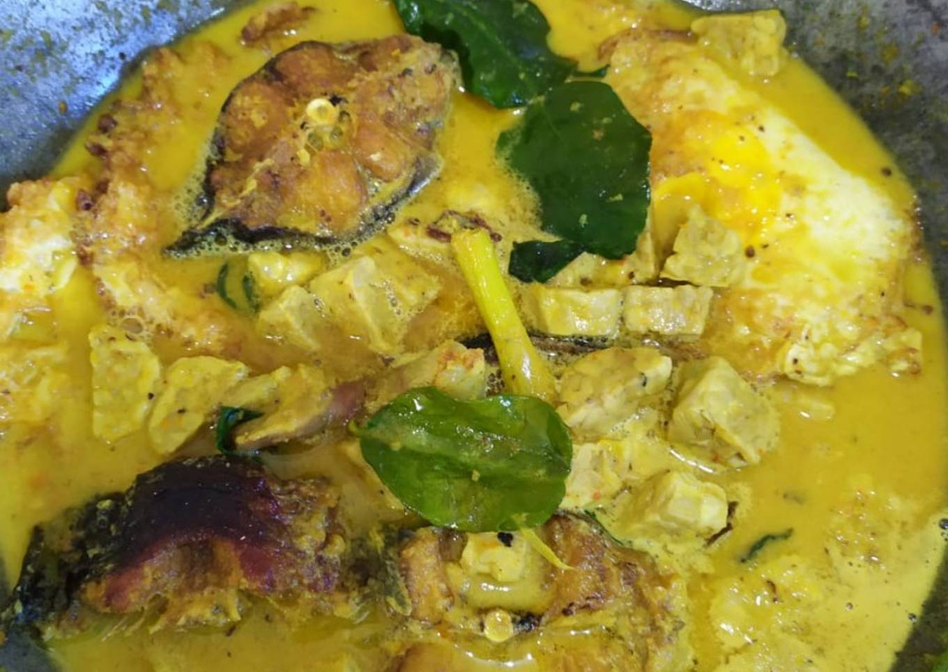 - Tumis bumbu halus dan masukan garam,penyedap rasa,gula pasir, merica, lengkuas, serai, daun salam, daun jeruk dan serai selama 1 menit kemudian masukan santan dan 100 ml air kemudian masukan potongan tempe,ikan dan telor tunggu sampai mendidih...siap disajikan selamat mencoba :)