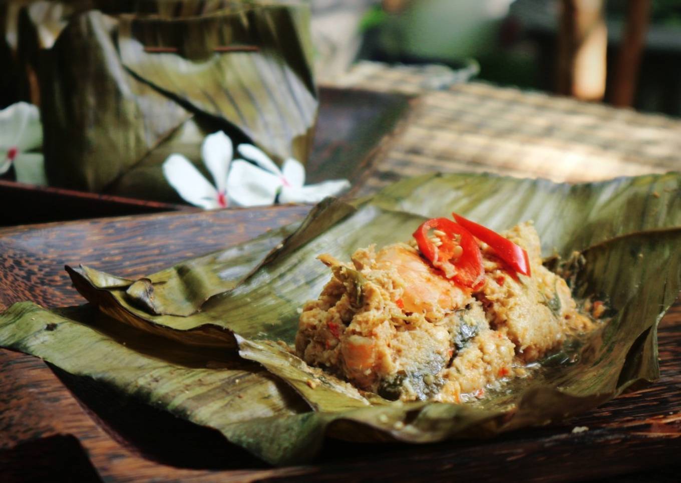 - Siapkan daun pisang yang sudah dilemaskan, lalu isi dengan beberapa sendok makan botok mentah. Bungkus dan sematkan dengan tusuk lidi.