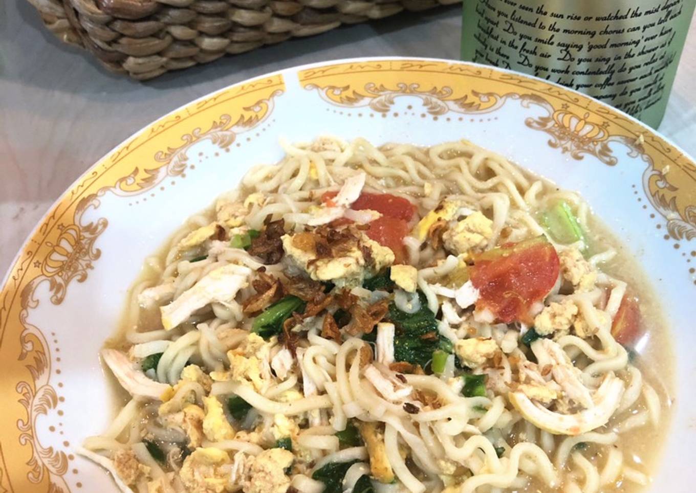 - Masukan irisan tomat, tambahkan garam, lada putih, dan kaldu bubuk. Bila sudah mulai mendidih, masukan mie telur aduk rata. Tambahkan suiran daging ayam, cabe rawit, sayur sawi, dan daun bawang. Aduk dan koreksi rasa. Tunggu sebentar hingga mie lebih lembut dan sayur matang. Sajikan selagi hangat.